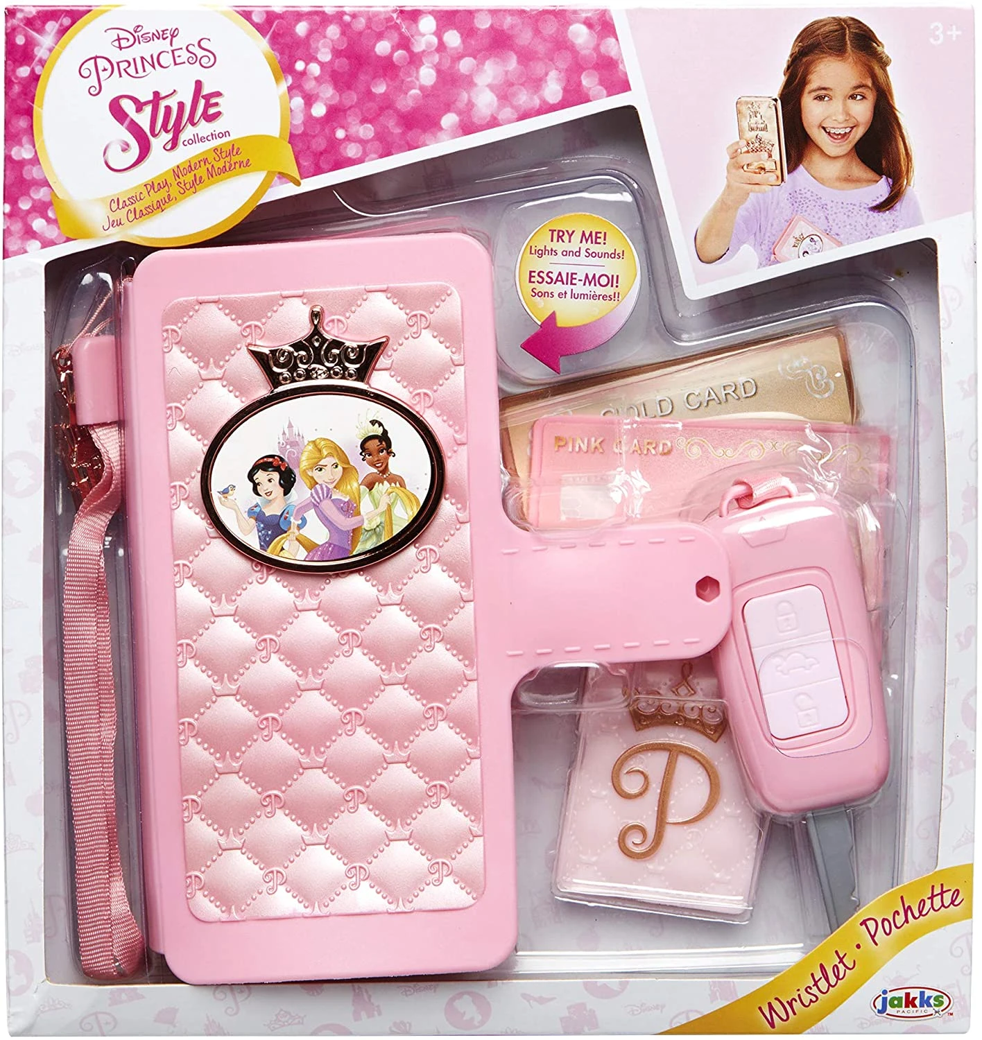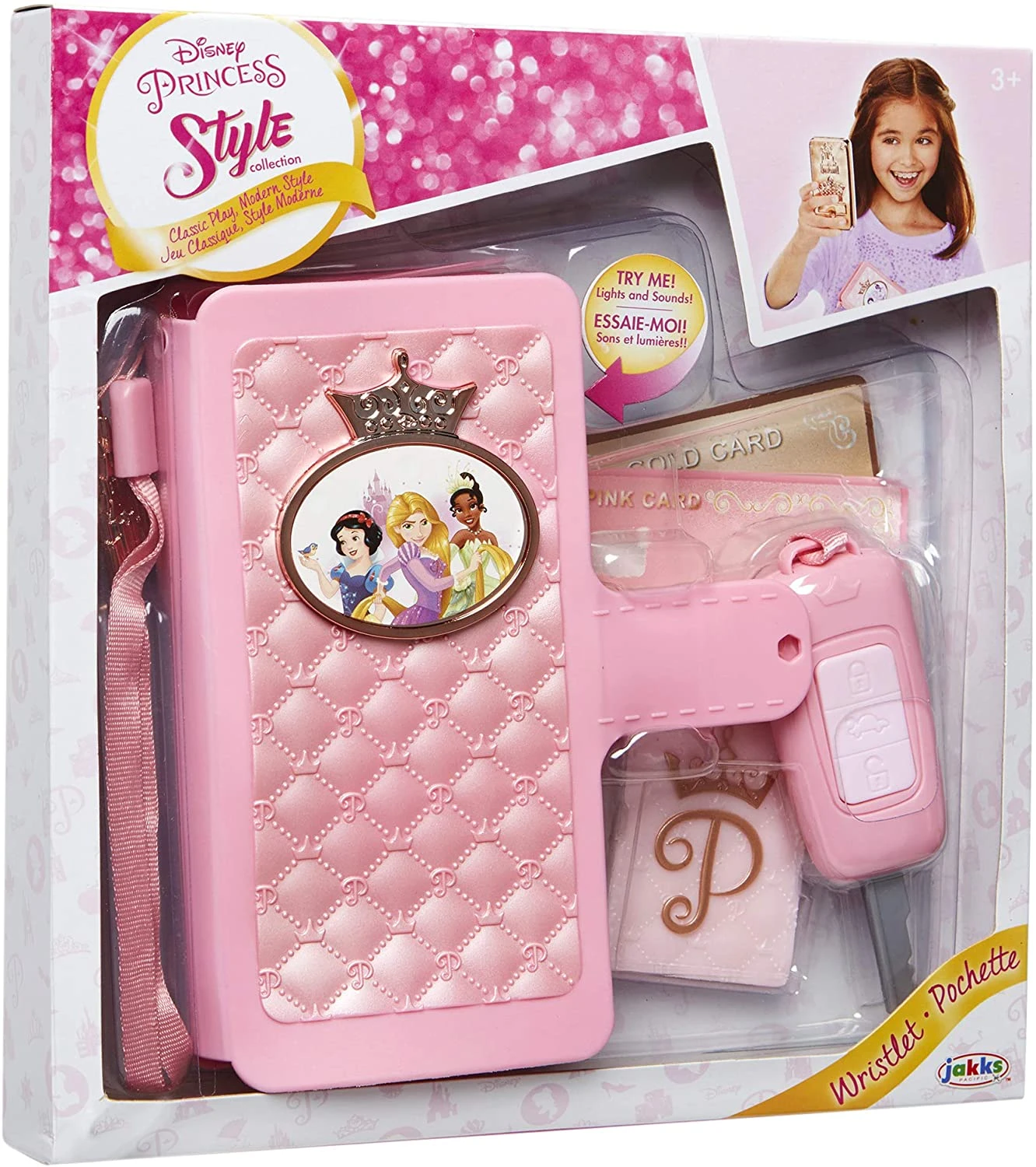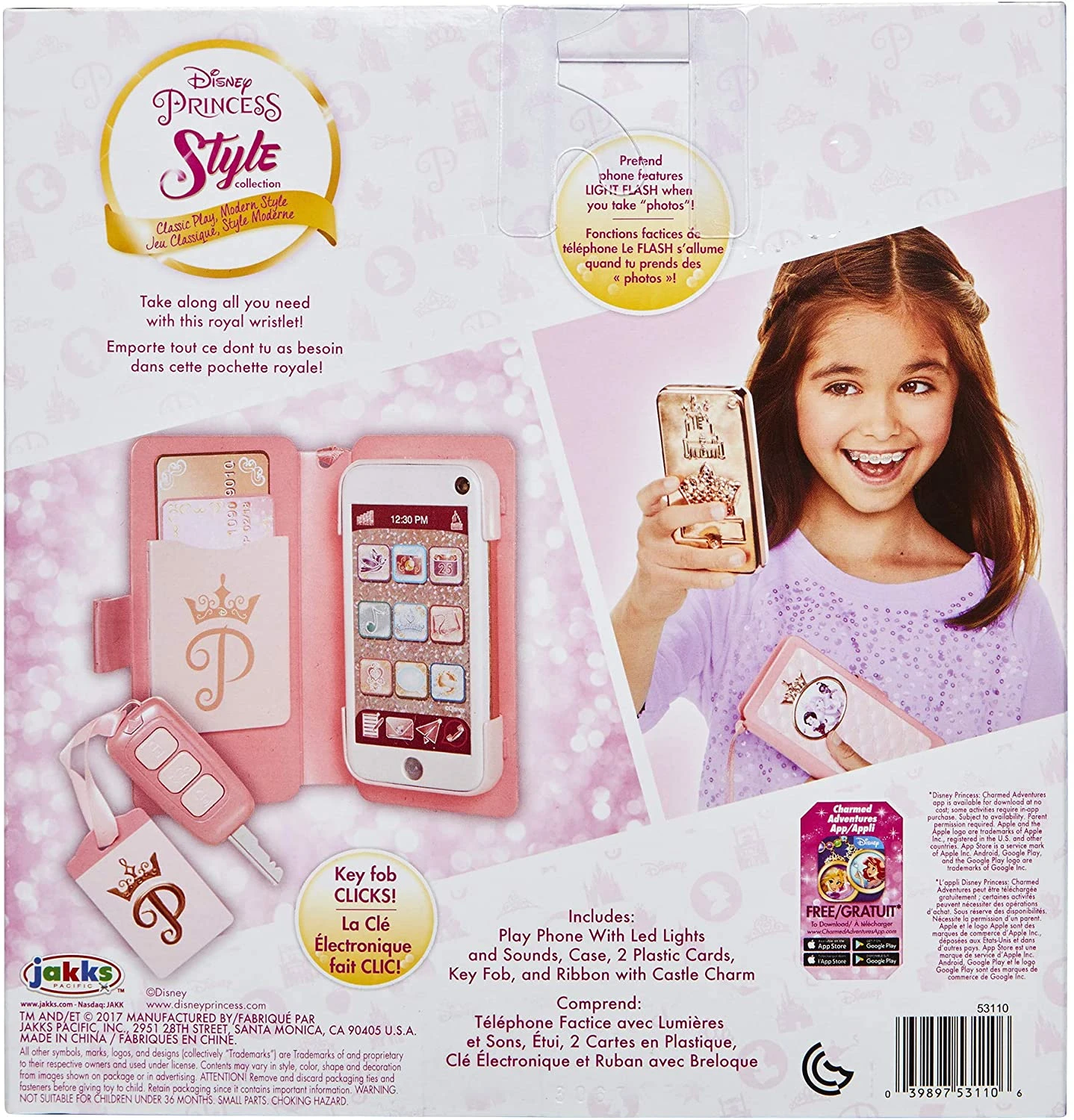 The Disney Princess style collection wristlet comes complete with play Smartphone and wallet case, key fob, and play credit cards. Press the keys to hear unique locking noise! Play Smartphone even flashes, like an actual Smartphone, when you pretend to take pictures too! Includes: play Smartphone with LED lights and sounds, wallet case, key fob, 2 plastic play credit cards, and ribbon with Castle charm. Requires 3 button cell batteries (included). recommended for ages 3+.