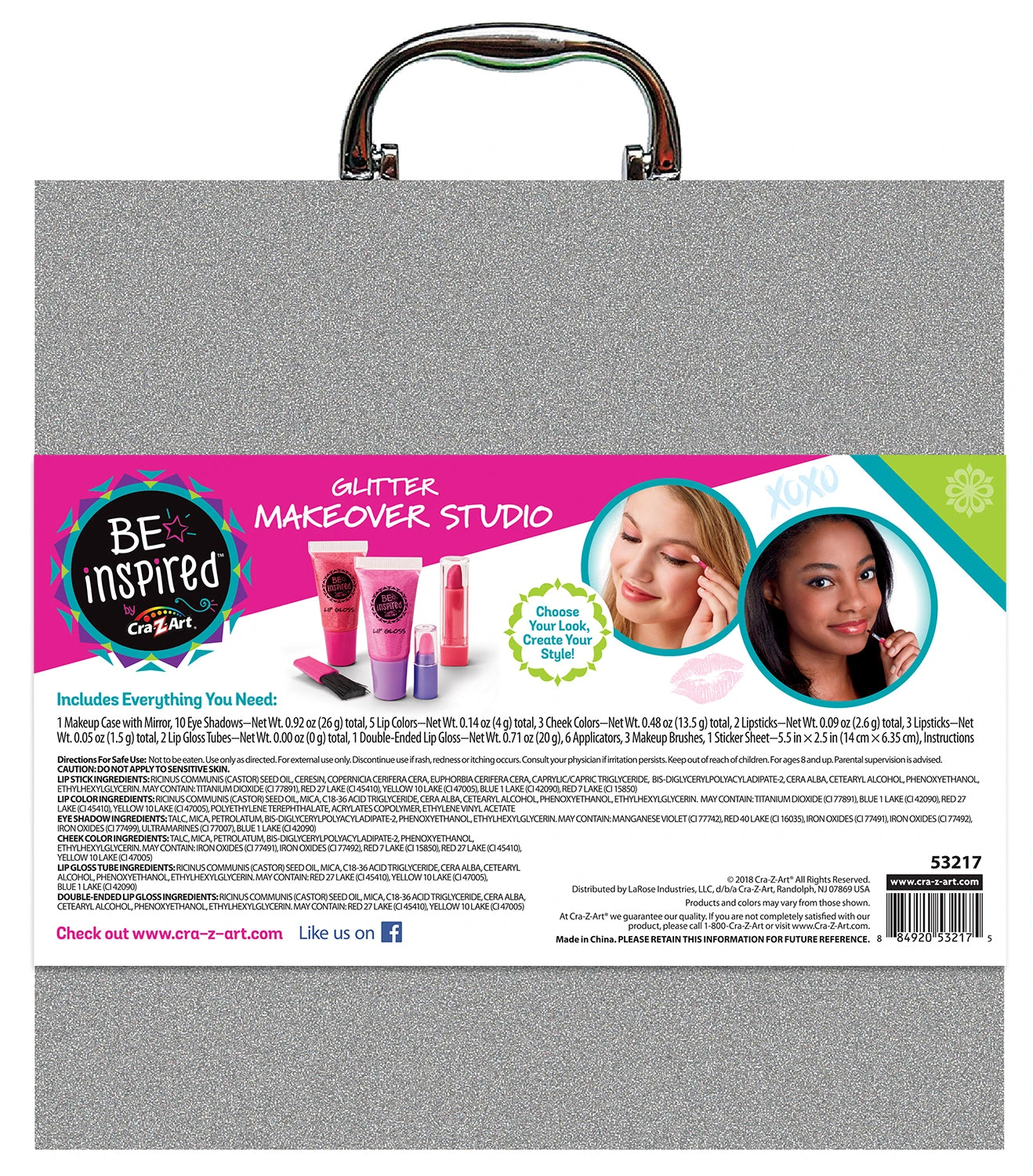 The Be Inspired Glitter Makeover Studio with Case by Cra-Z-Art is glam-tastic! This glamour collection includes over 35 makeup colors, brushes, and more for eyes, cheeks, and lips! Choose your look, create your style! Comes in a metallic shimmer carry case to keep all your supplies handy. A totally dreamy makeup set that’s perfect for beginners or on-the-go beauty lovers! This ultimate makeup artist case comes with everything you need for an amazing makeover: makeup case with a mirror, 20 eye shadows, 5 lip colors, 3 cheek colors, 5 lipsticks, 2 lip glosses, 1 double-ended lip gloss, 6 applicators, 3 makeup brushes, 1 sticker sheet, and easy to follow step by step instructions. Makeup is safe and non-toxic. For ages 8 and up. Be “always creative” with Cra-Z-Art!