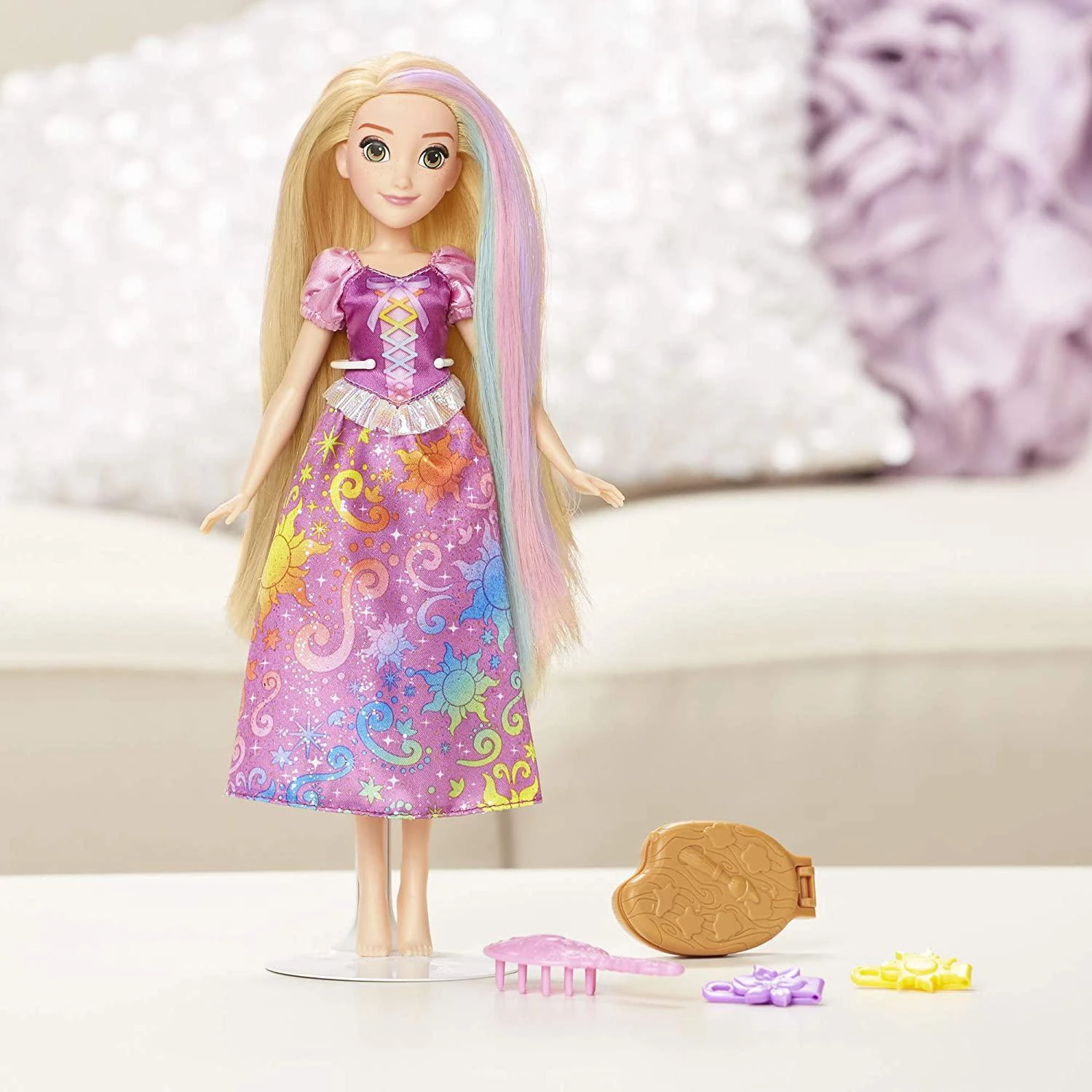 Rapunzel is all about adventure…and hair, lots and lots of hair. With Rainbow Styles Rapunzel, kids can give her luscious locks a rainbow twist! Take a section of hair, put it in the paint palette-inspired chalk styler at the top of her head, and slide it down her hair. There are 3 chalk colors in the styler — blue, pink, and purple — creating a rainbow highlight on her hair. The more applications kids apply, the more vibrant the color gets. She also comes with 2 hair clips, a brush, and a rainbow-hued dress. Chalk washes out with water so, when hair dries, kids can play hair styler to their favorite Disney Princess again and again!