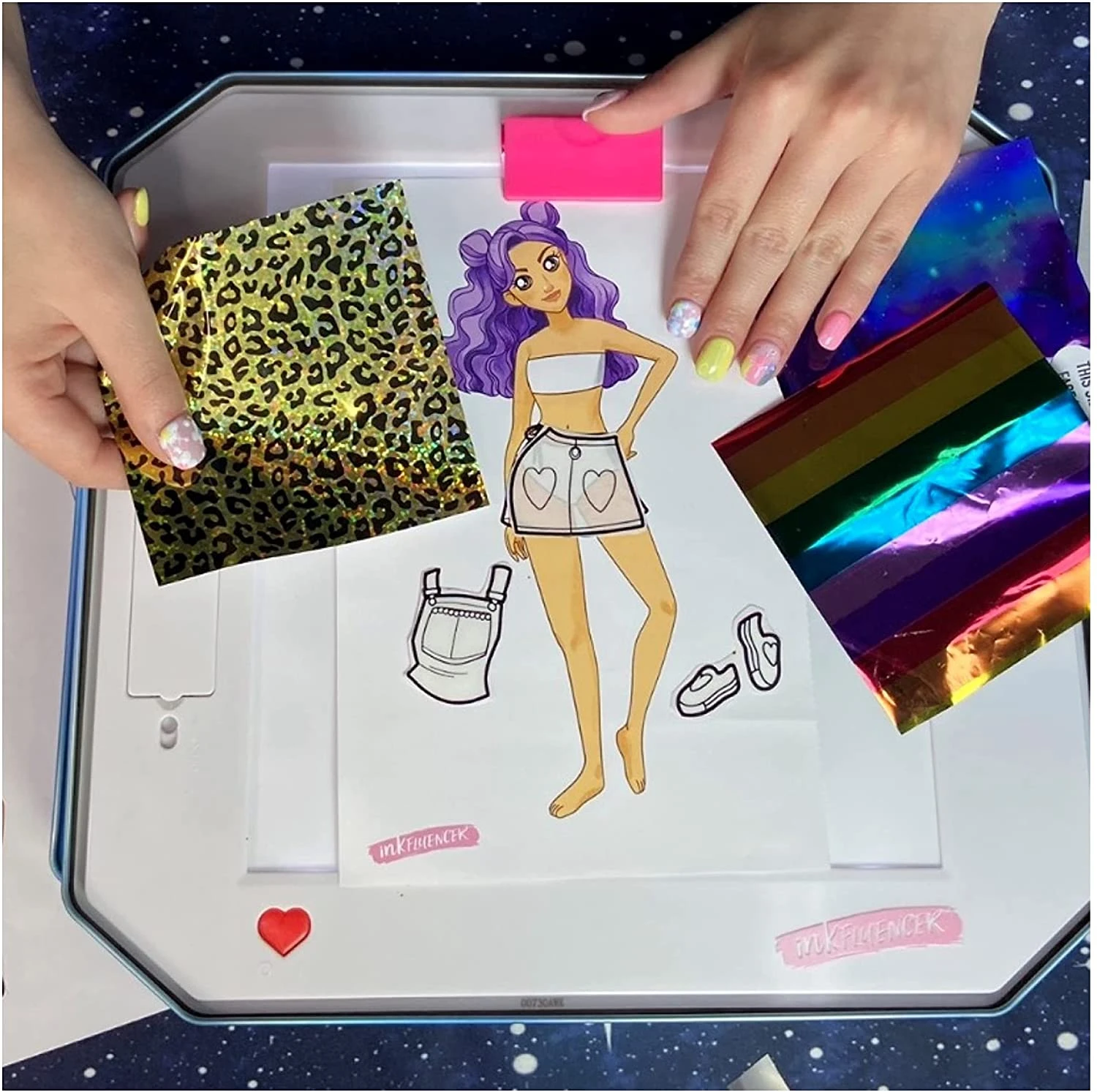 Create your own stylish looks with the inkFLUENCER Style N Create Light Desk! Partnering with TikTok influencers We Wear Cute, inkFLUENCER brings you fun, trendy, social media-inspired DIY art supplies. The Style N Create Light Desk comes with everything you need to create and customize your own influencer-inspired looks! First, choose one of eight models to style and select the clothing you want from the sticker sheets: skirts, jackets, pants, tops, accessories and more! Carefully cut out your outfit and remove the sticker backings. Apply the clothing stickers onto your model and peel to reveal a sticky area left on the surface. Next, embellish and style your outfits with the metallic transfer patterns! With eight stylish patterns, set one on top of the clothing and firmly rub to make the pattern stick. Finally, peel the transfer off to reveal the filled-in area! The Style N Create Light Desk’s unique transfer system makes it so easy to design inside the lines for flawless fashions; the metallic transfers only adhere to the sticky parts from the clothing stickers! You can also give your looks design accents by layering patterns on top of each other! When you’re finished designing, slide your completed model under one of the included filters and make it shine! Turn on the desk’s light and share your super cute look with friends. You can also use the Style N Create Light Desk to trace your own custom looks with the model and clothing tracing set – all you need is some blank paper and a pencil! For easy storage, everything fits inside the cool, crafty reusable premium case. For even more ways to create, look for the inkFLUENCER Click N Color Marker Set (sold separately). Mix and match to design your stylish looks with the inkFLUENCER Style N Create Light Desk!