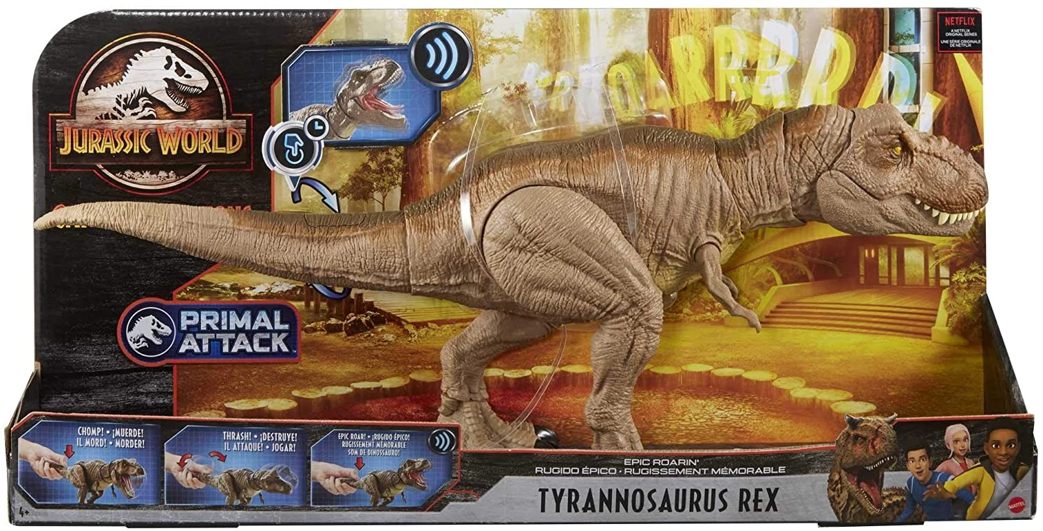 Inspired by the Jurassic World Camp Cretaceous series, the larger-sized Epic Roarin’ Tyrannosaurus Rex figure lets kids roar into action with “Primal Attack” and realistic shaking!