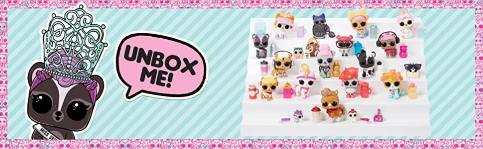 Unbox 7 surprises with each L.O.L. Surprise! Eye Spy Series Pet. Unbox the spy glass to find codes and unlock surprises! As you unbox each layer, a surprise is unveiled, hinting at which L.O.L. Surprise Pet you’re going to get! L.O.L. Surprise! Eye Spy Series Pets includes puppies, kitties, bunnies and even skunks, ponies and owls! Match the pet to the L.O.L. Surprise! Doll to complete the family: Showbaby, Lil Showbaby and Showpony! There’s a new way to unbox your accessories! Scoop in the litter box for surprises! Feed or bathe L.O.L. Surprise! Eye Spy Series Pets for a water surprise! Collect them all!