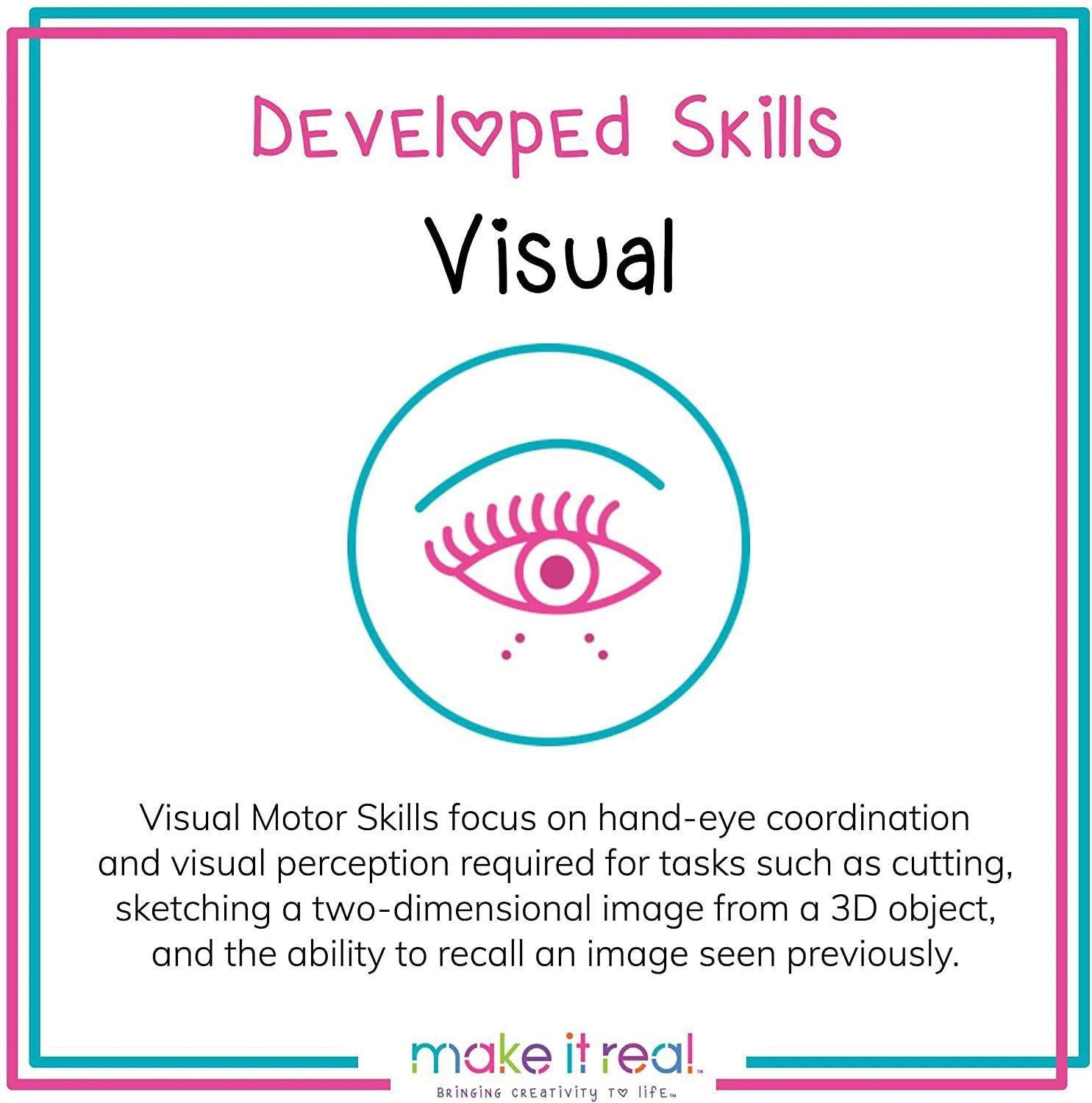 Visual SkillsVisual Skills focus on hand-eye coordination and visual perception required for tasks such as cutting, sketching a two-dimensional image from a 3D object, and the ability to recall an image seen previously. |