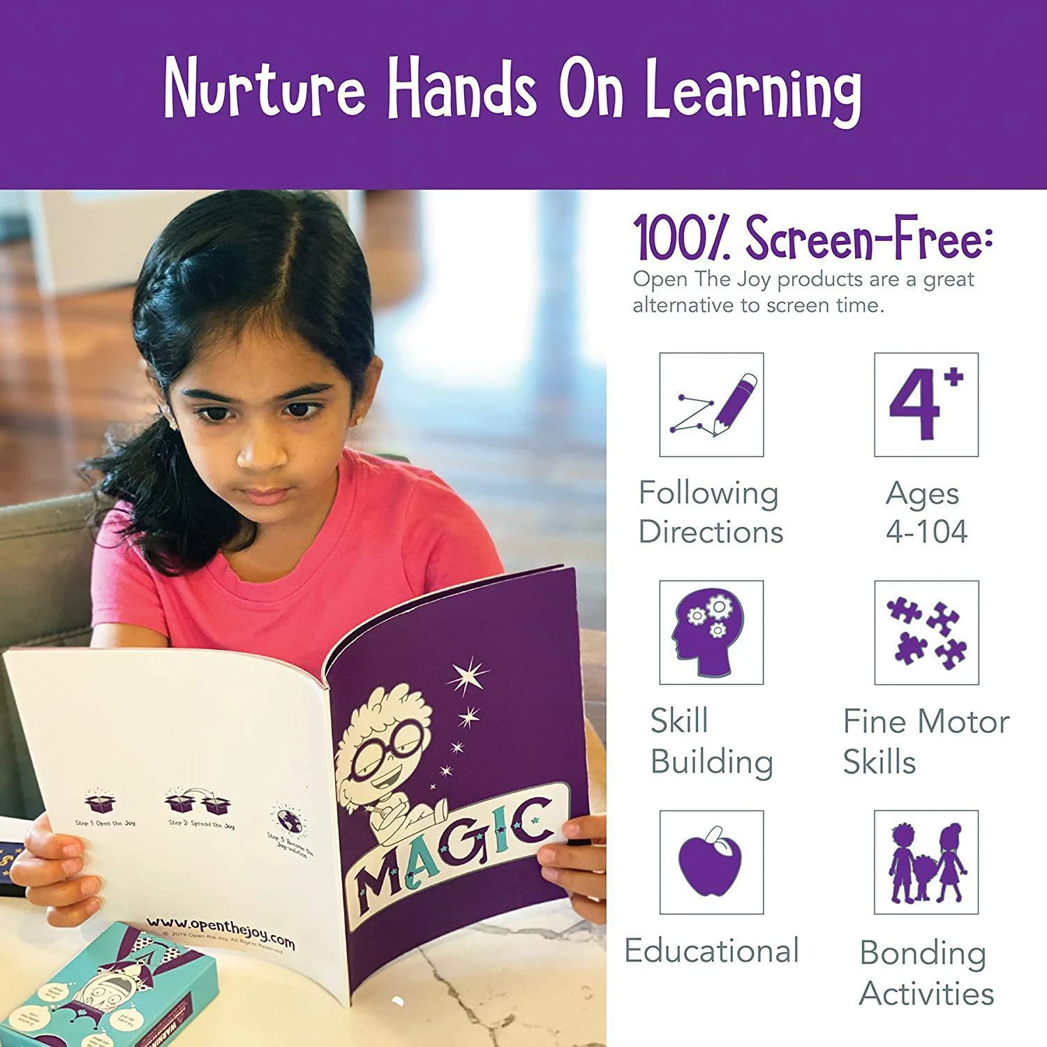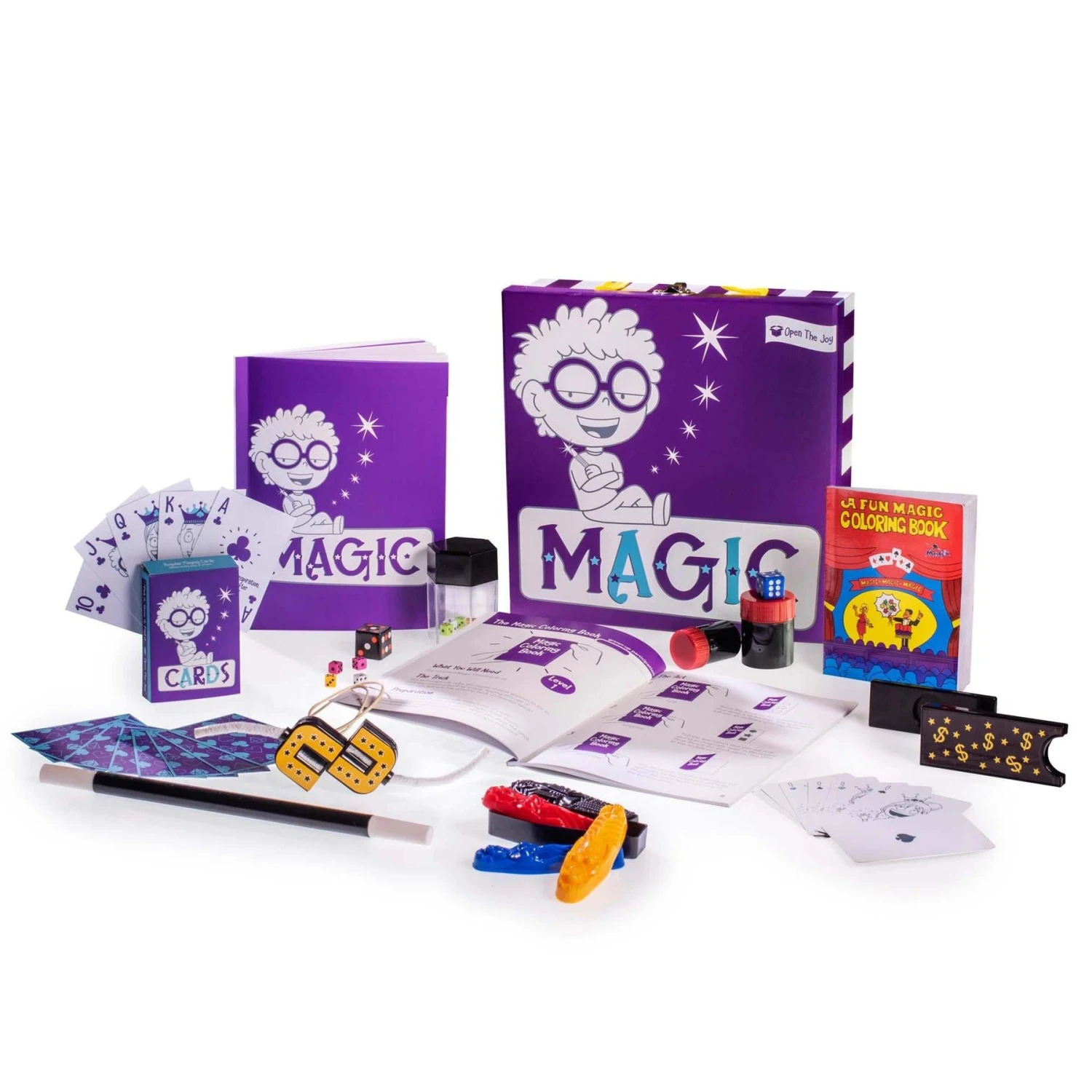 Experience Open the Joy Magic Kit for Kids – the very best magic kit available on the market today. The Premium Magic Kit to grow your child’s creative side and social skills. Non-stop entertainment for everyone. The loaded magic set includes: magic coin slider, magic rope cutter, exploding dice magic set, magic coffin and mummy set, big and small magic canister set, magic coloring book, Open the Joy trick cards, Open the Joy coloring cards, and instruction book for 20 tricks. Magic show on the go. Includes a high-quality purple carrying box to carry all your magic supplies.