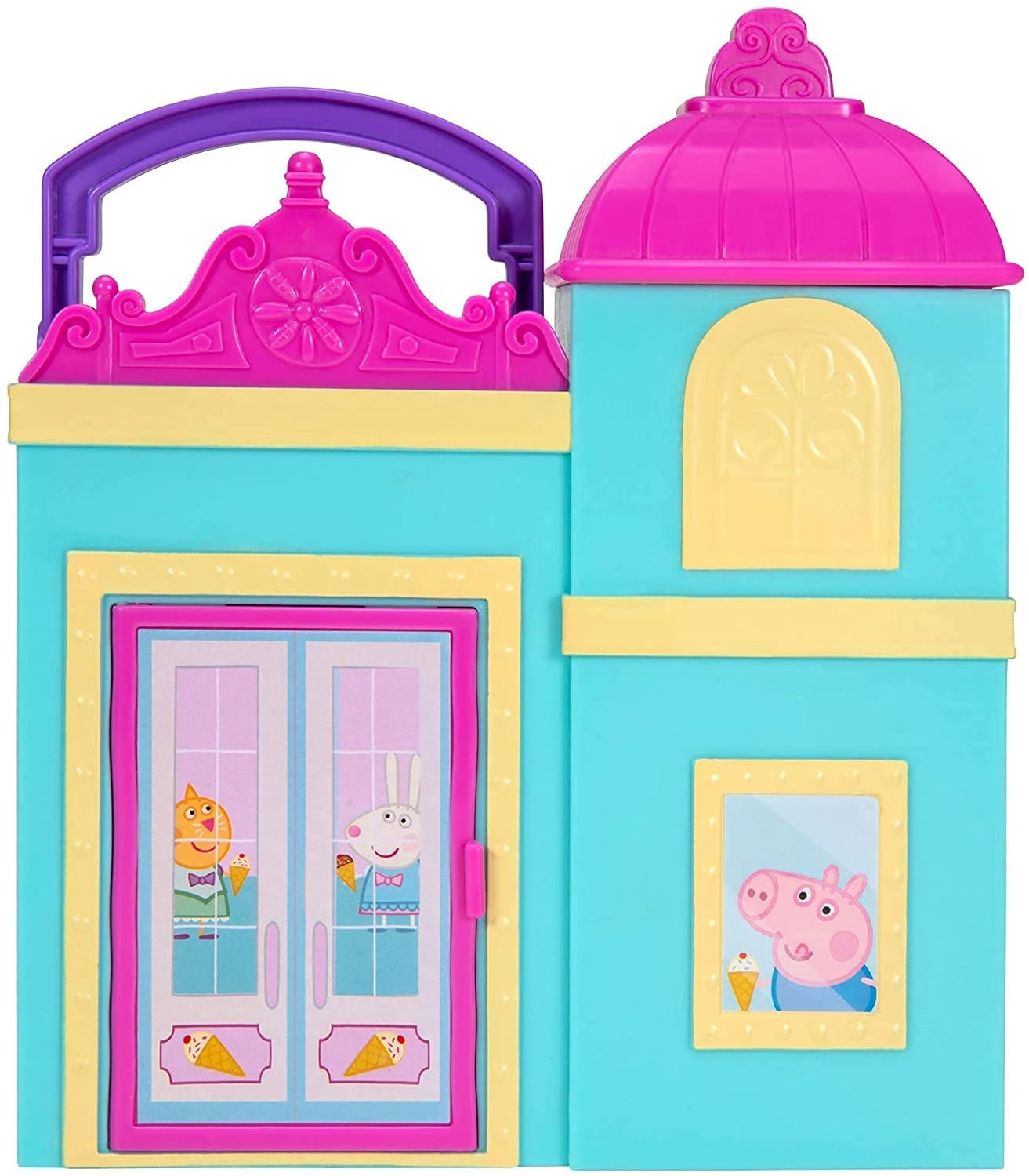 - The 4 piece toy set includes a foldable Ice Cream shop carry case, an exclusive Peppa figure in an ice cream dress, cash register and ice cream stand! Playset opens for play and stores all pieces inside when closed! It also includes a carry handle for on-the-go play!