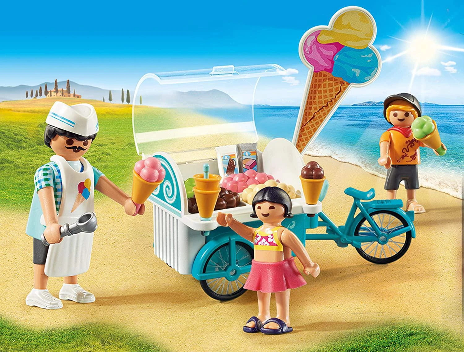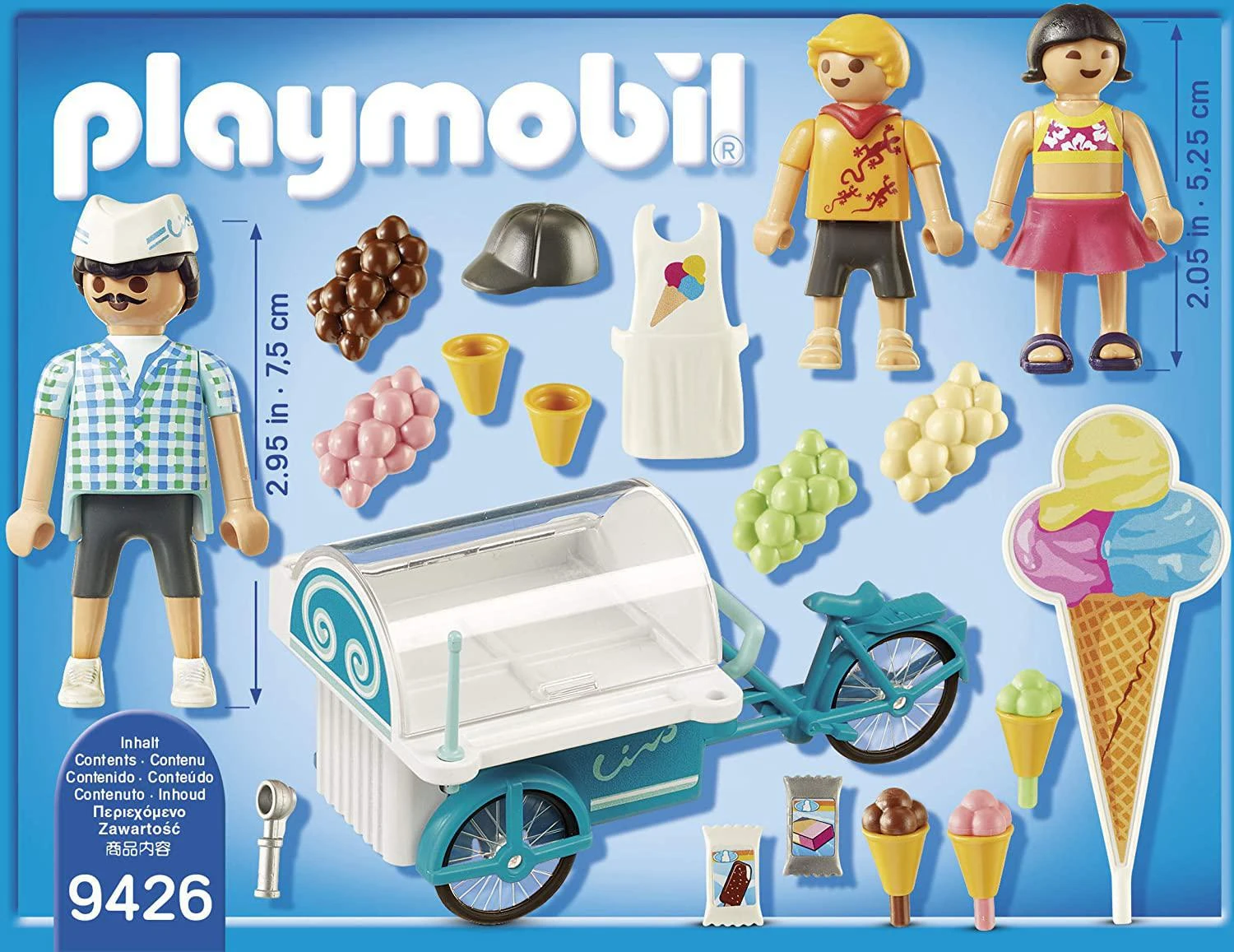 - Combine this set with the rest of the PLAYMOBIL summer villa theme (#9420-9426 – sold separately) to fully bring the story to life! Set includes one adult figure, two child figures, ice cream cart, ice cream flavors, waffle cones, sign, ice cream scoop, and other accessories