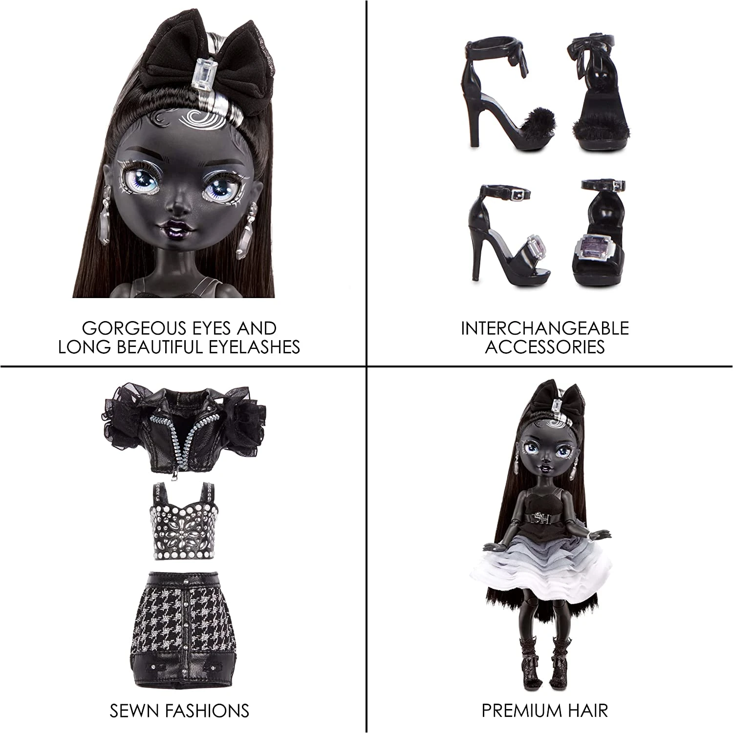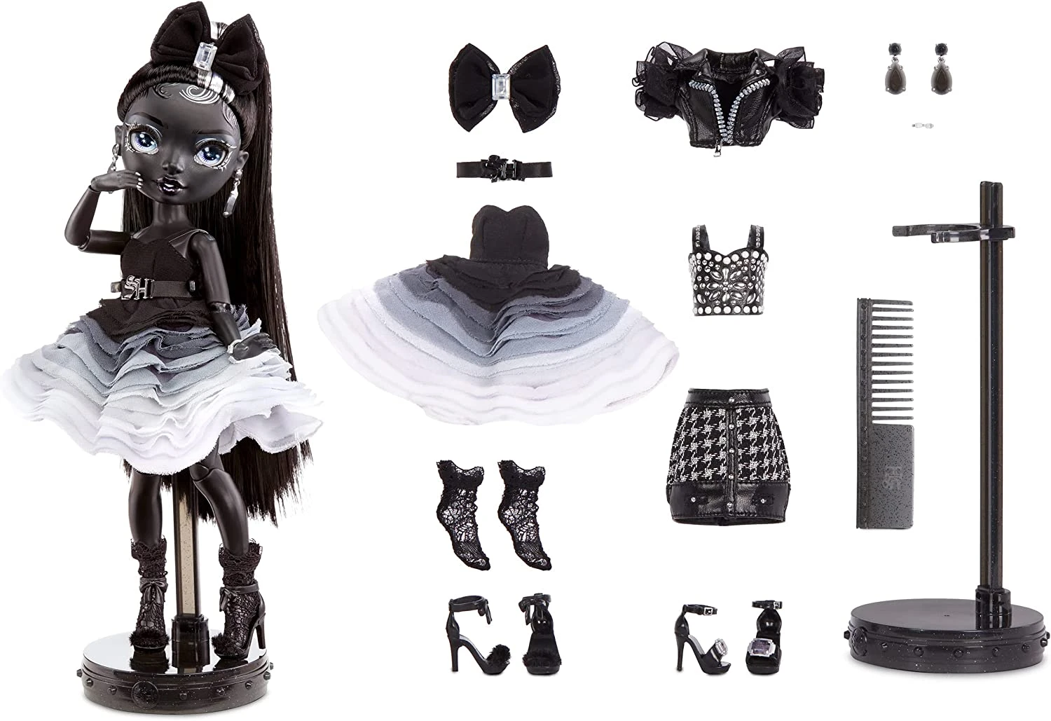 - GORGEOUS FEATURES: Shanelle Onyx has a unique design and is dressed in black accents from head to toe. She has gorgeous, detailed features in her fashion, beautiful black straight hair, long real eye lashes and glass eyes. Collect the Rainbow of all the gorgeous Shadow High fashion dolls.