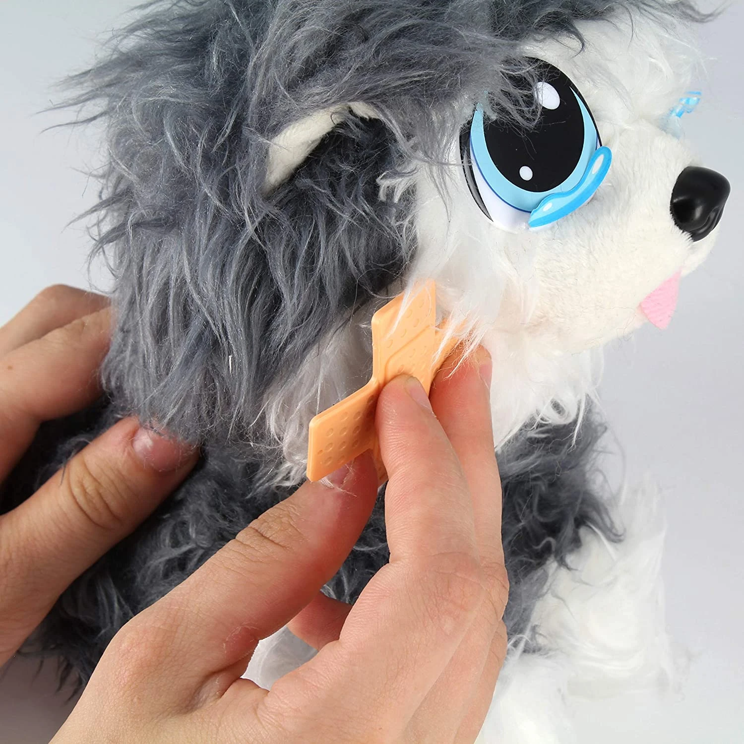 Use the included grooming kit and healing accessories to pluck out the “Fleas,” remove their bandages, cast or cone, clean their paws, wipe away their tears and brush their fur. Search carefully through their fur to find the hidden tick and pull it out! Perk up their ears to complete the transformation.