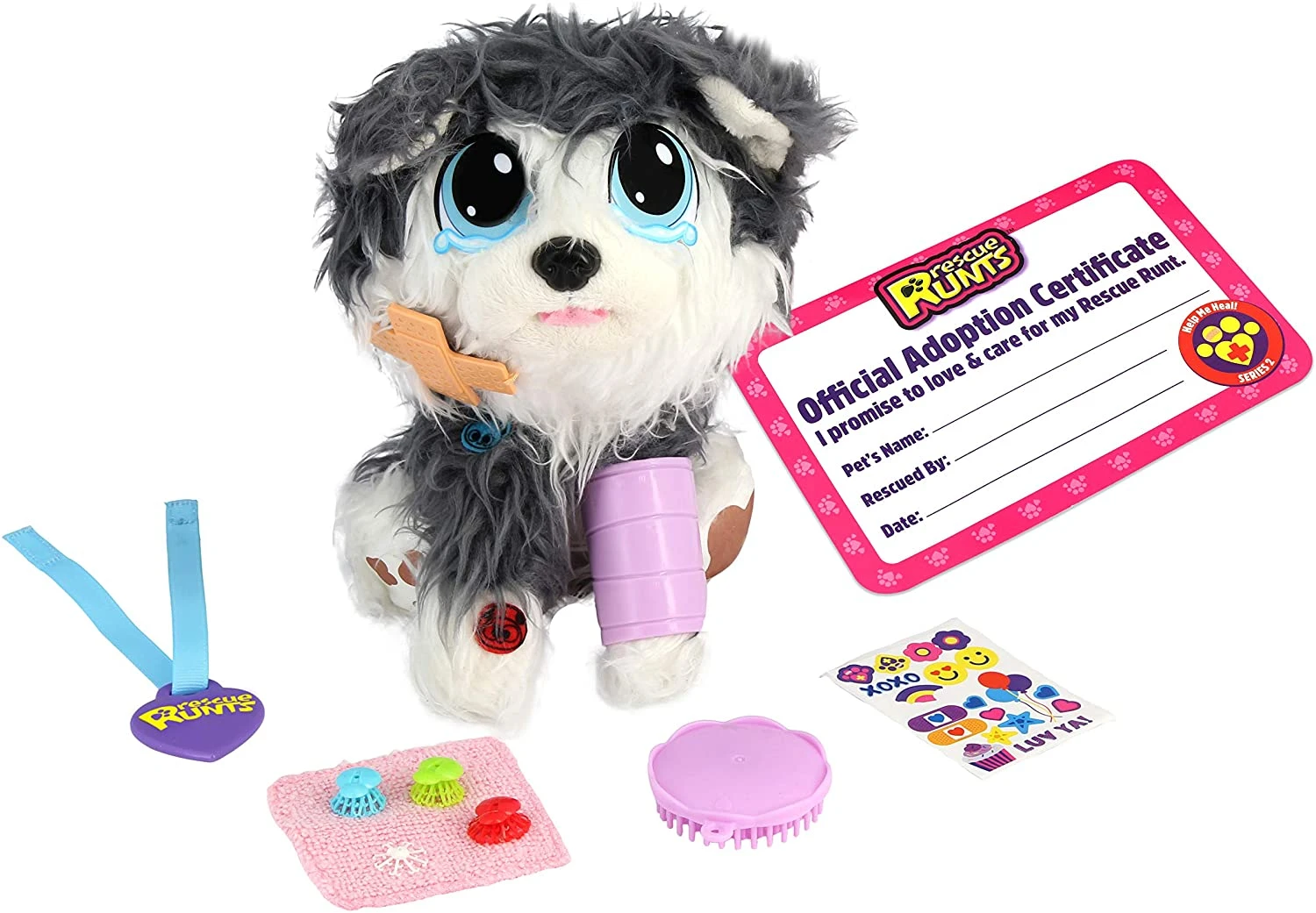 Now there are even more Rescue Runts to adopt, groom and love with Series 2: help me heal! These runts need even more love and care to nurse them back to health. Rescue Runts pets arrive on your doorstep with matted fur full of fleas, dirty paws and boo-boos. Each pet comes with new healing accessories like a cone or cast to decorate and re-usable band-aids and bandages. Use the included grooming kit and healing accessories to pluck out the Fleas, remove their bandages, cast or cone, clean their paws, wipe away their tears and brush their fur.