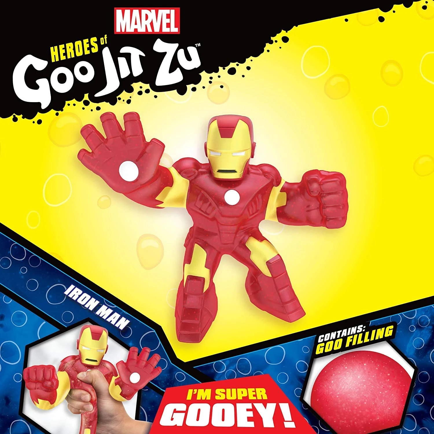 - Iron Man is super gooey! Squeeze his body and watch metallic goo filling bulge out.